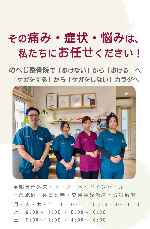 足のことならなんでも、のへじ整骨院にお気軽にご相談ください。